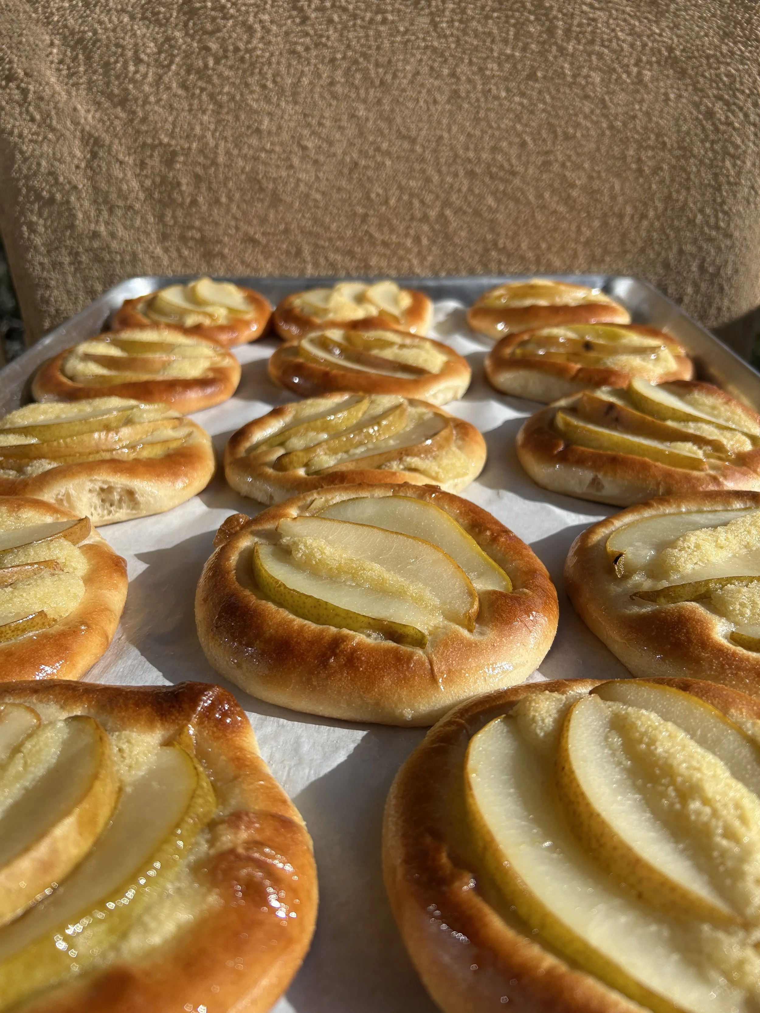 Pear Frangipane Bun; Sweet Pastry dough topped with house almond-pastry cream and organic bartlett pears. Available Fall and Winter