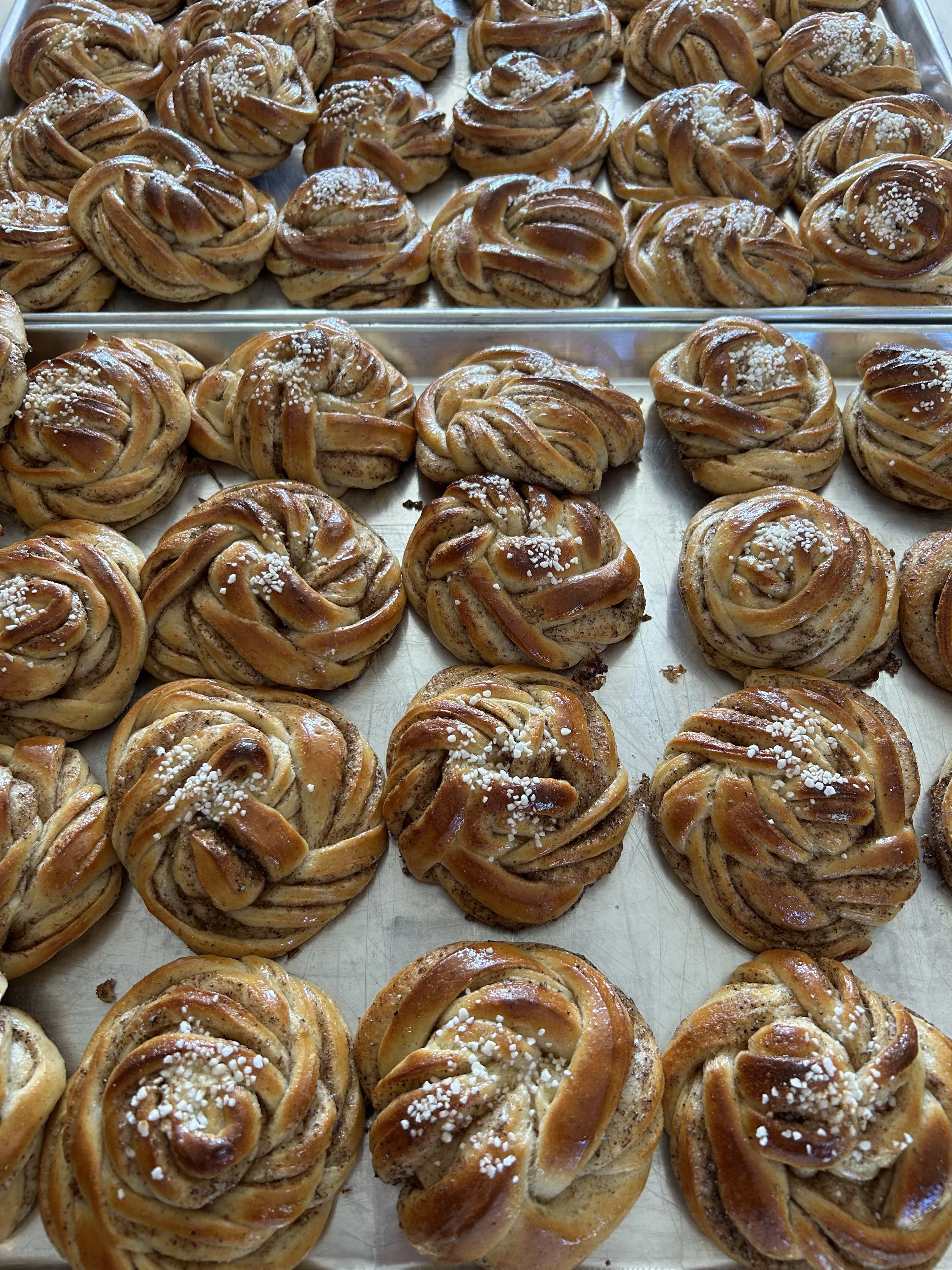 Cinnamon Cardamom Bun (swe. Kanelbulle); a staple of Swedish coffee and snack culture. There are one million different ways to shape this treat. Ours is something like a knotted ball of yarn. hint: Braid, Twist, and Swirl.